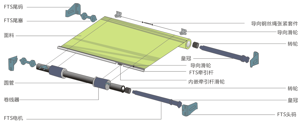 1,每套系统使用两合同型号的FTS专用管状电机和一个电子控制盒 2,丽料需要较大的抗拉强度 91香蕉app汅站无限看,一般选用玻璃纤维+PVC阳光面料.