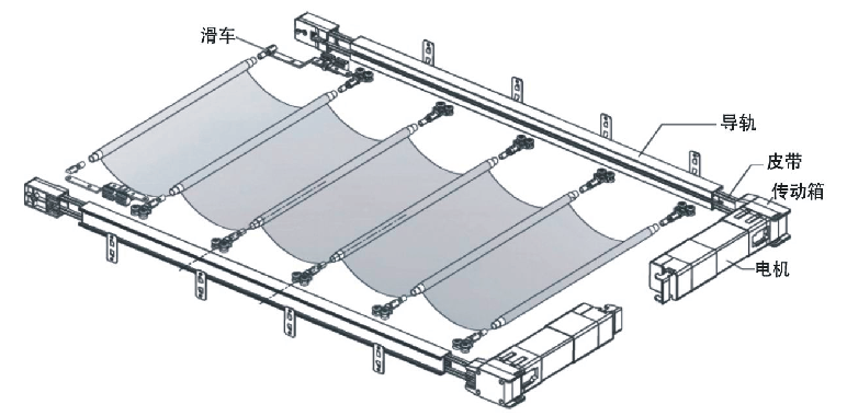 3,采用履带传动方式 91香蕉app汅站无限看,电机转速相同,保证天棚帘的开合同步 .